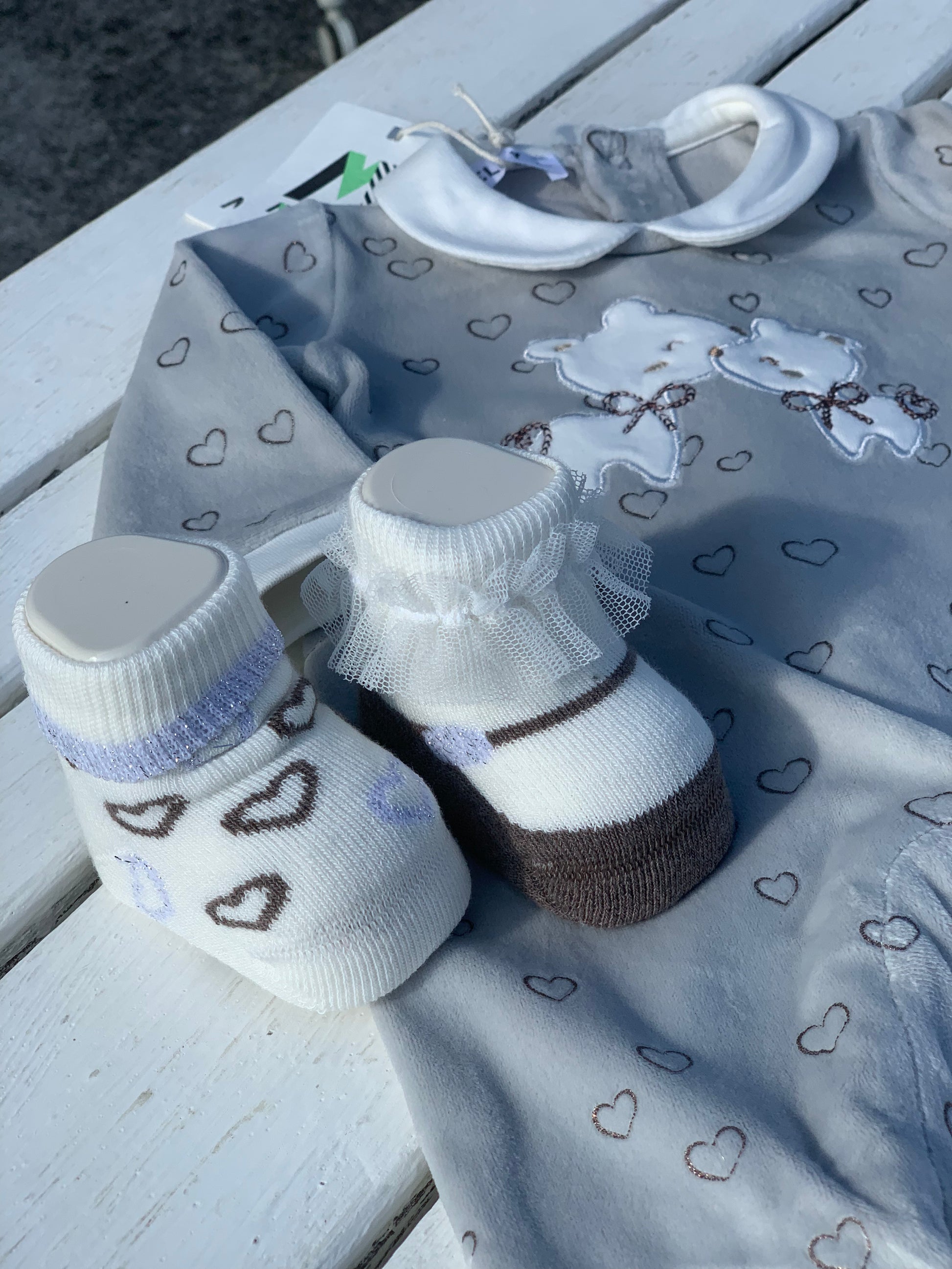 Copripiedi per neonata realizzati in spugna con vezzosi dettagli nei toni neutri e venduti nella collezione bipack.