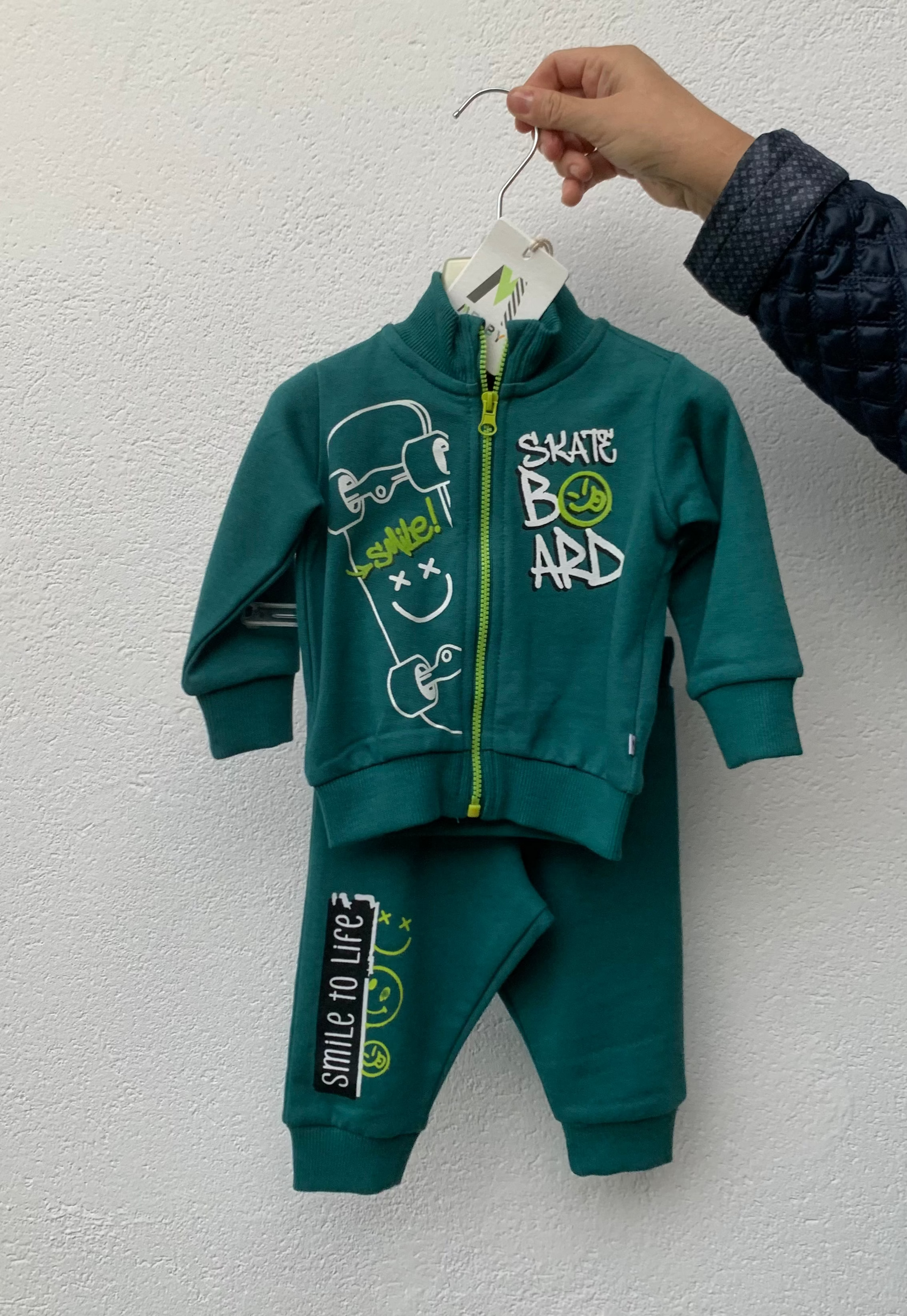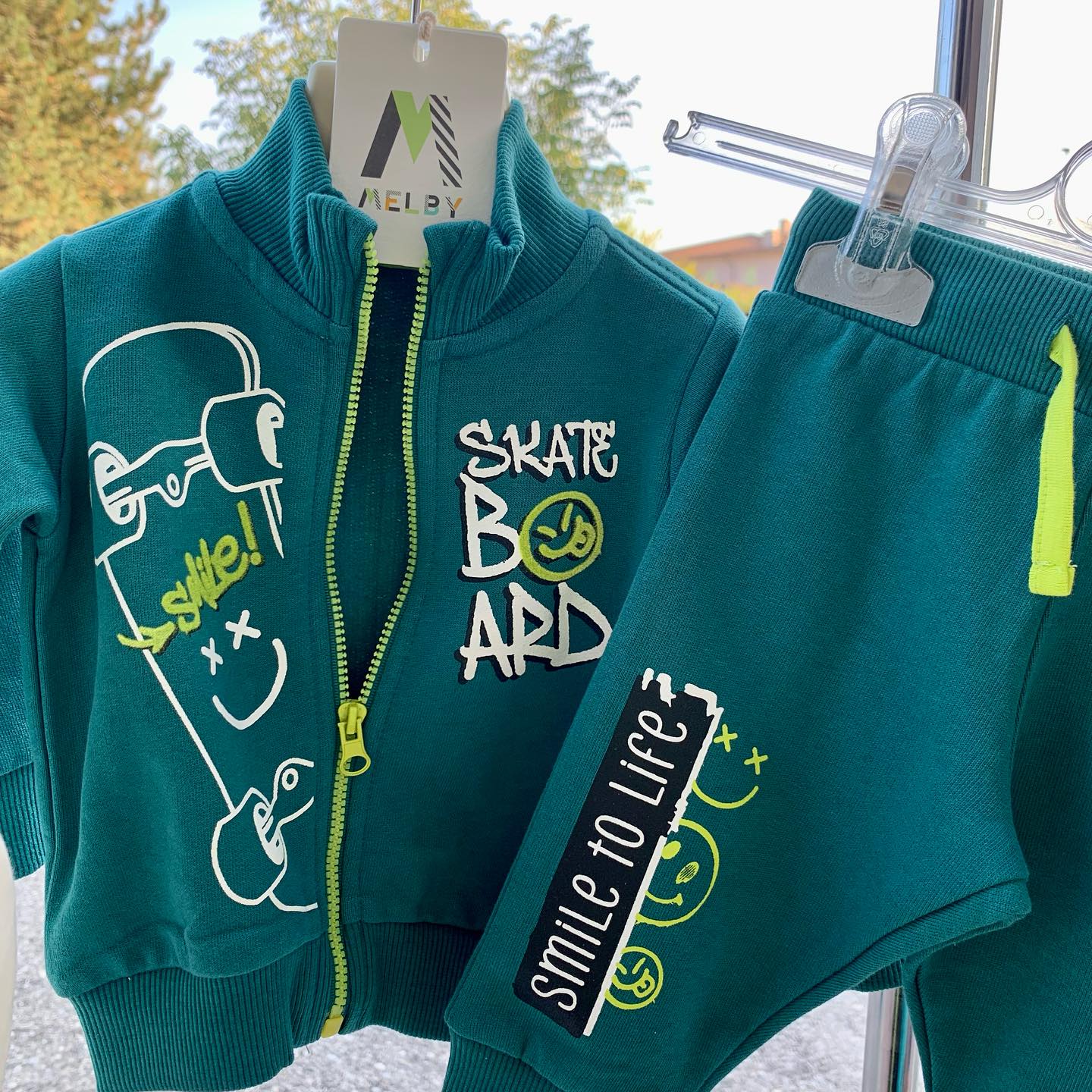 Completo Melby con felpa zip verde bottiglia e joggers abbinati. Dettagli stampa stile street. Super pratico!