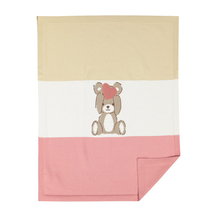 Coperta unisex realizzata in tricot caldo cotone 100%, con 3 fasce di colore e tenera decorazione centrale.
