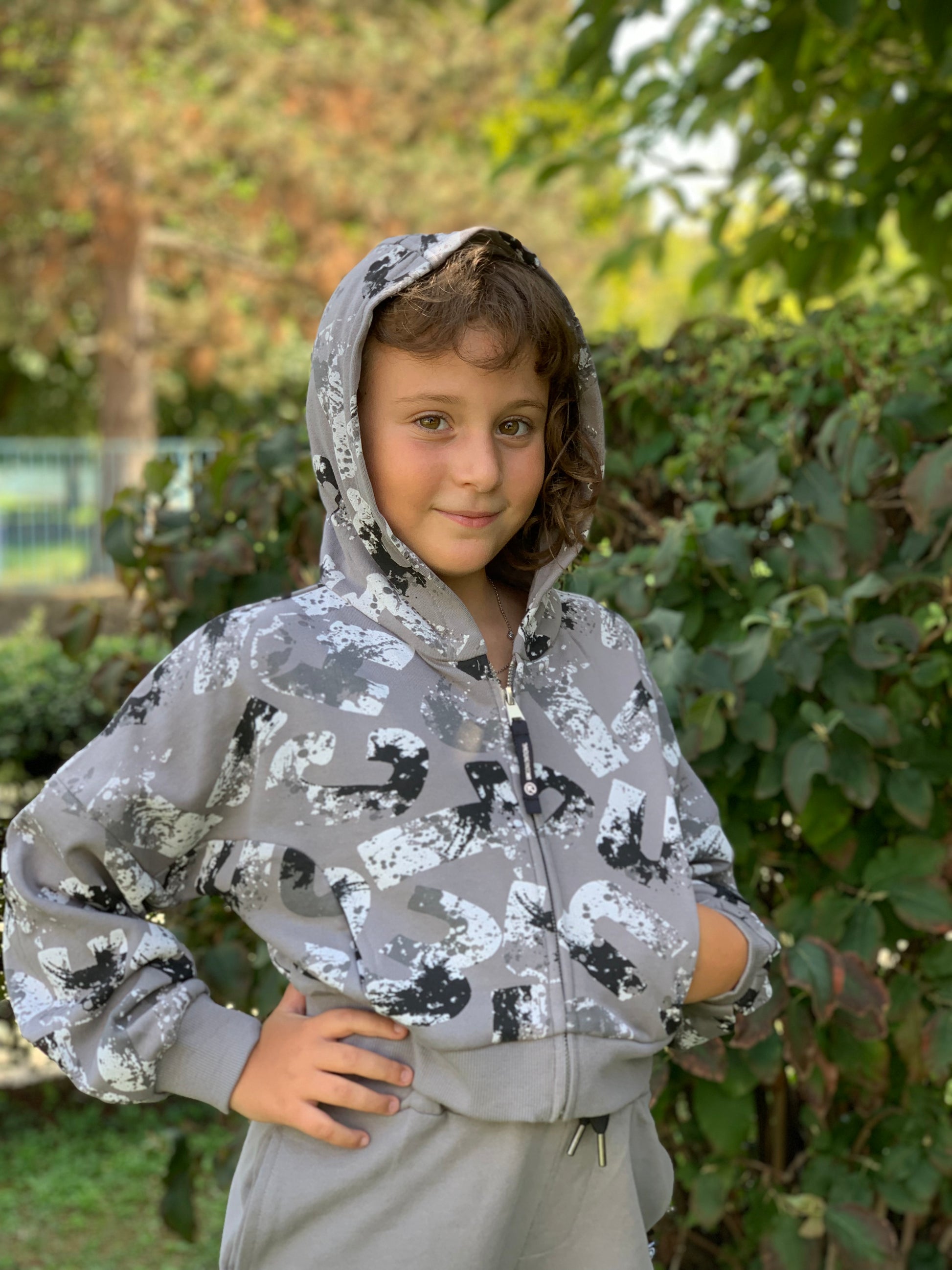Felpa cropped full-zip con cappuccio per ragazza, con stampa allover dal sapore street.