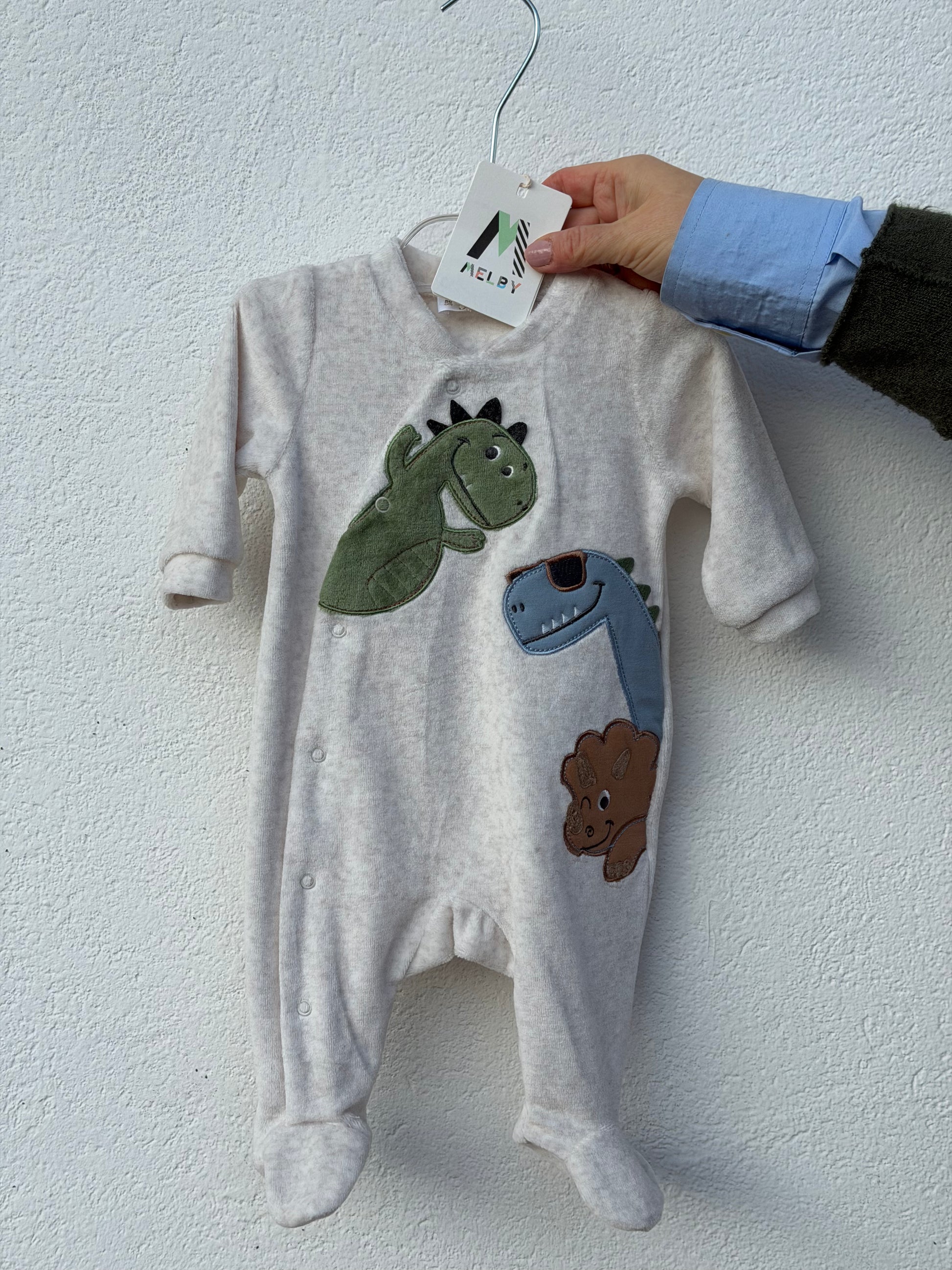 Tutina Melby in ciniglia colore écru con applicazione dinosauri sul fronte e bottoncini sul retro. Molto bella!
