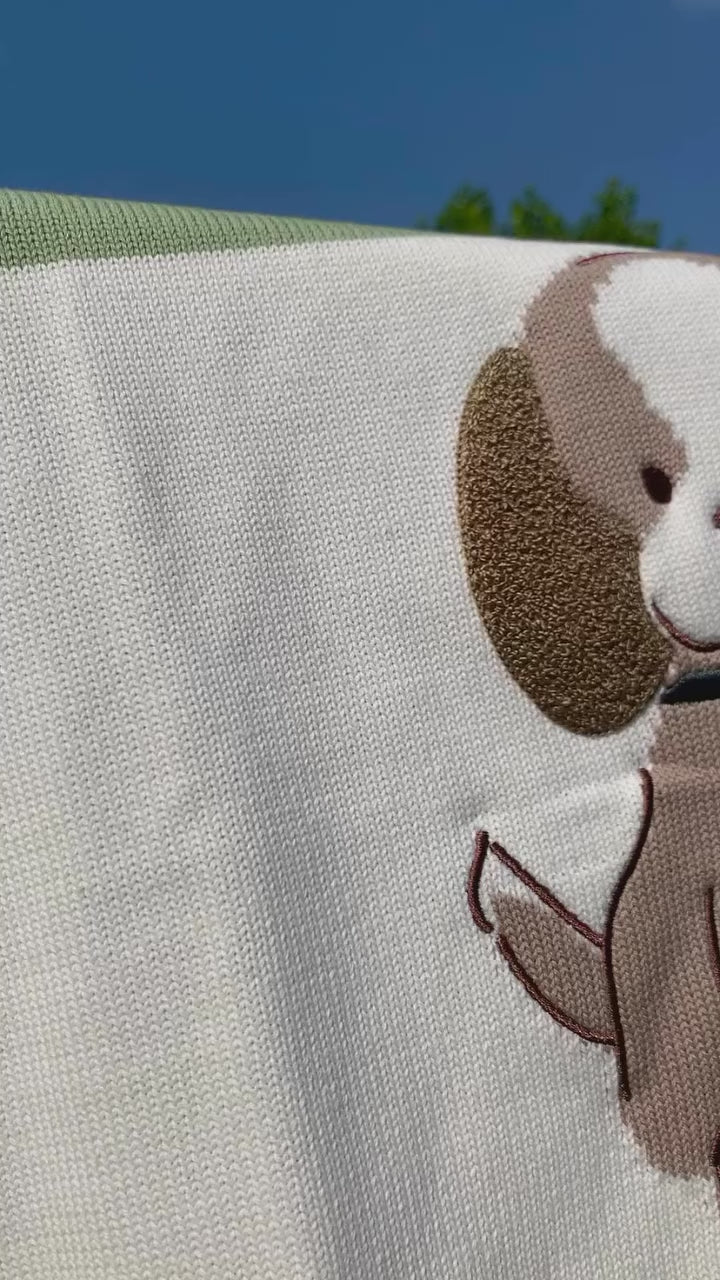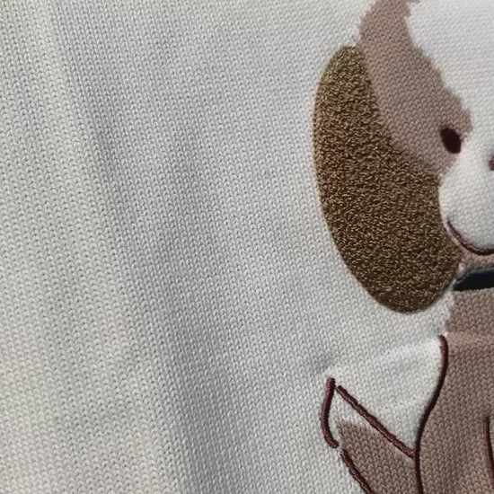 Tutina Melby realizzata in tricot di caldo cotone, con tenera decorazione frontale e lavorazione in costina su polsini e fondo gamba.