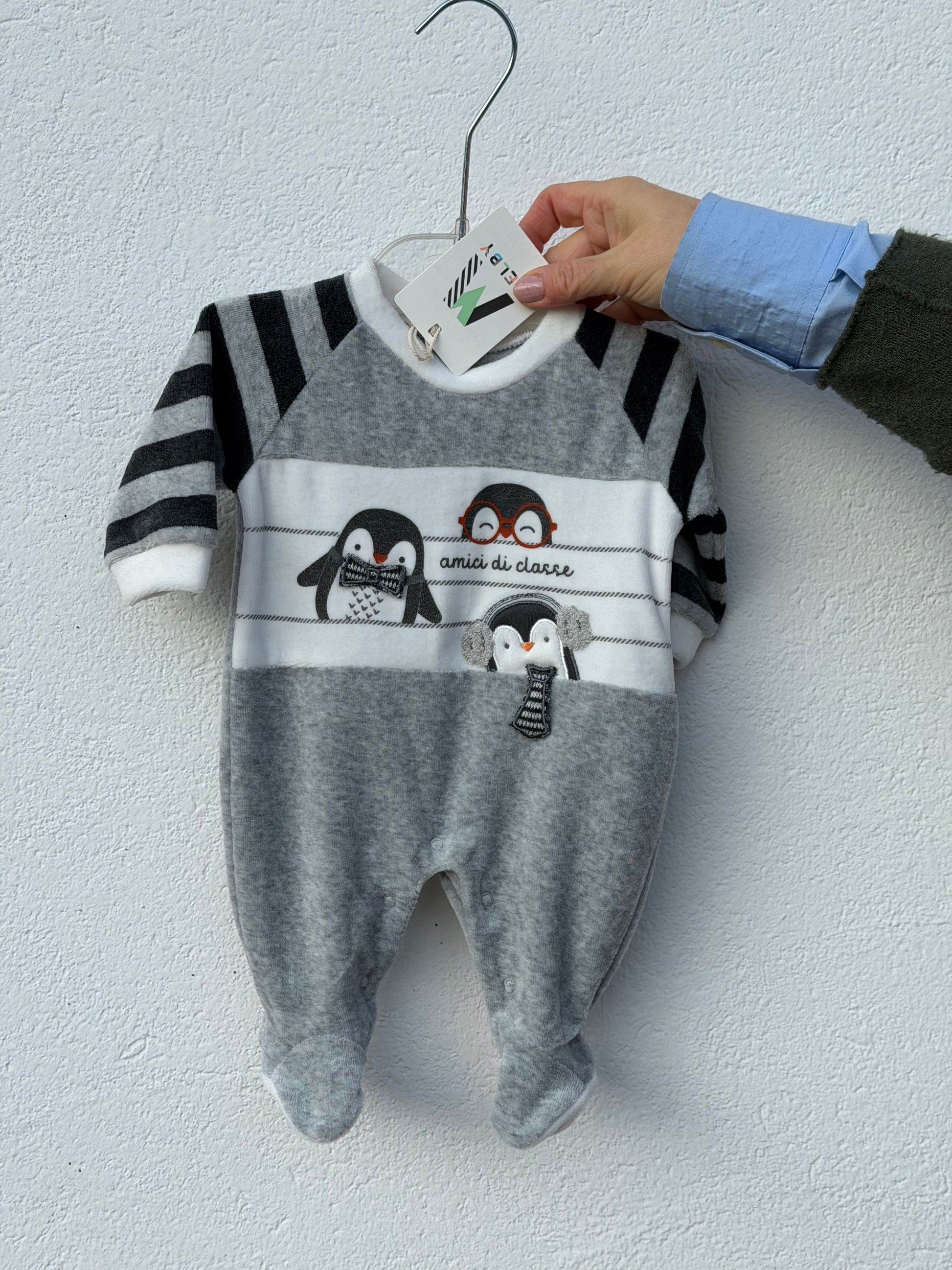 Tutina Melby in ciniglia sui toni del grigio con fantasia pinguini sul fronte e bottoncini sul retro. Molto bella!