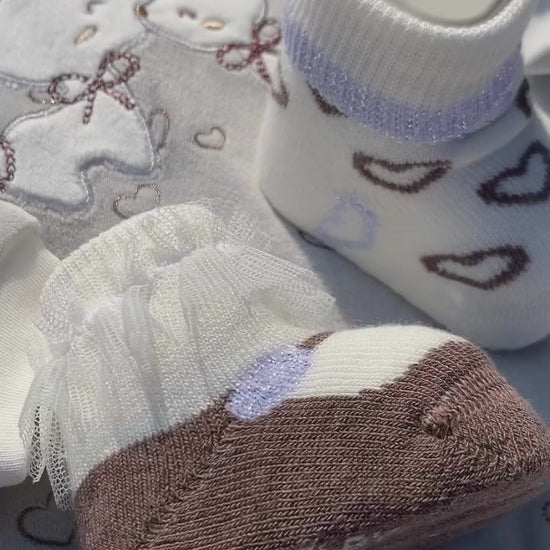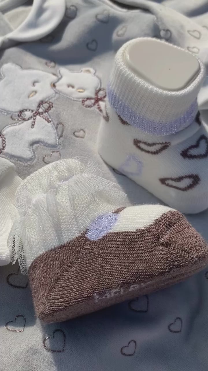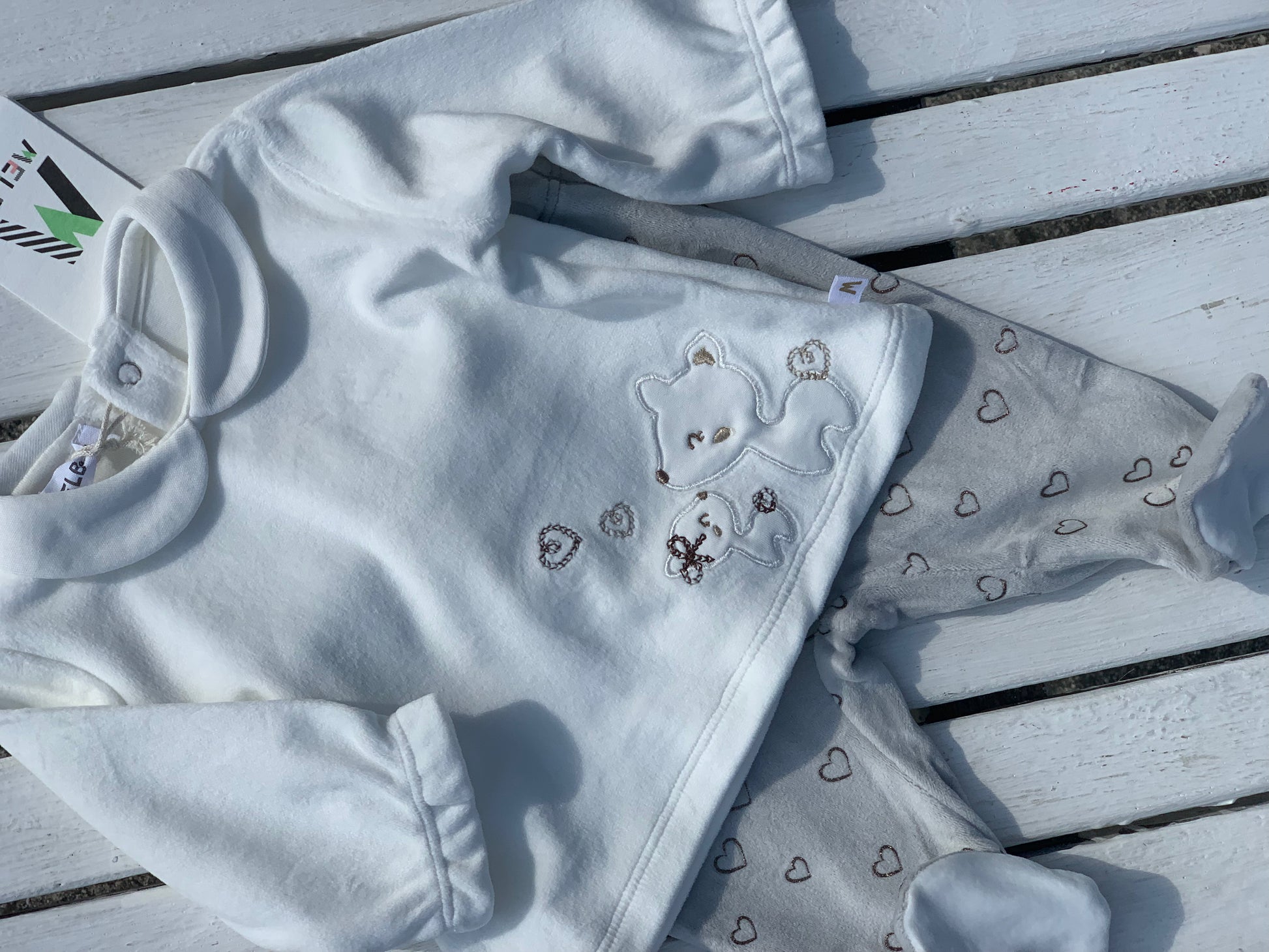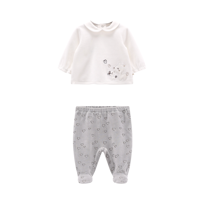 Completo clinica per neonata, composto da una maglia a maniche lunghe con colletto bebè e da un pantalone con piede, tutto realizzato in ciniglia soft.