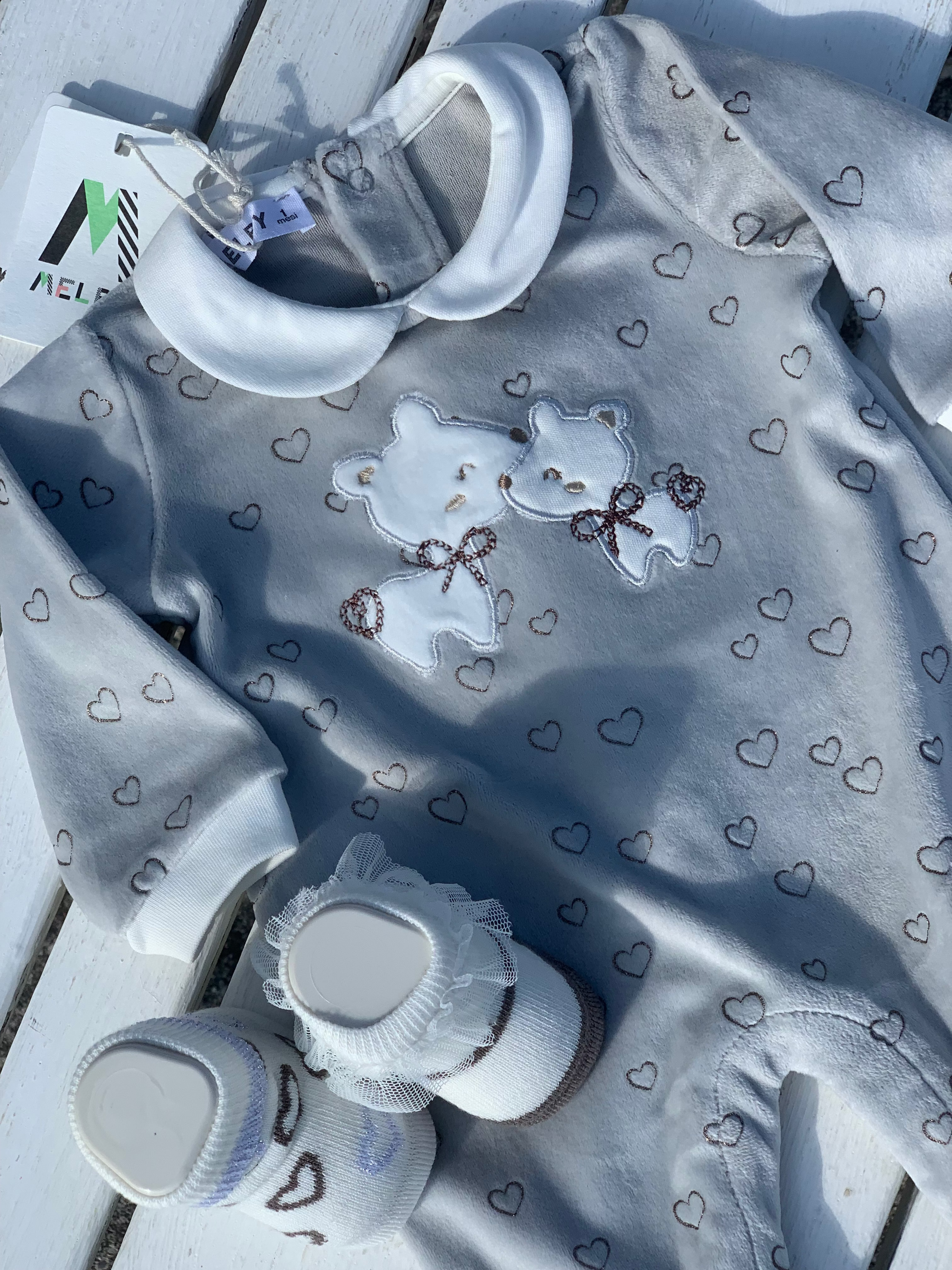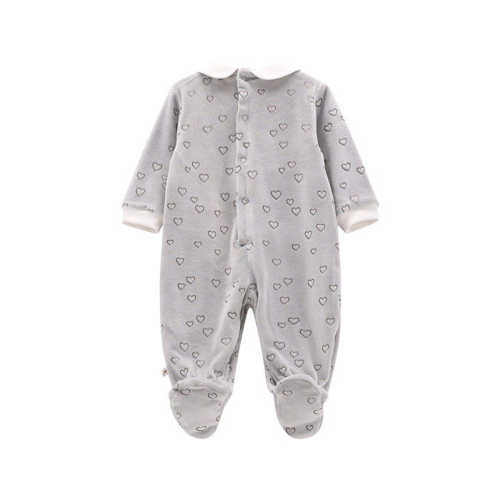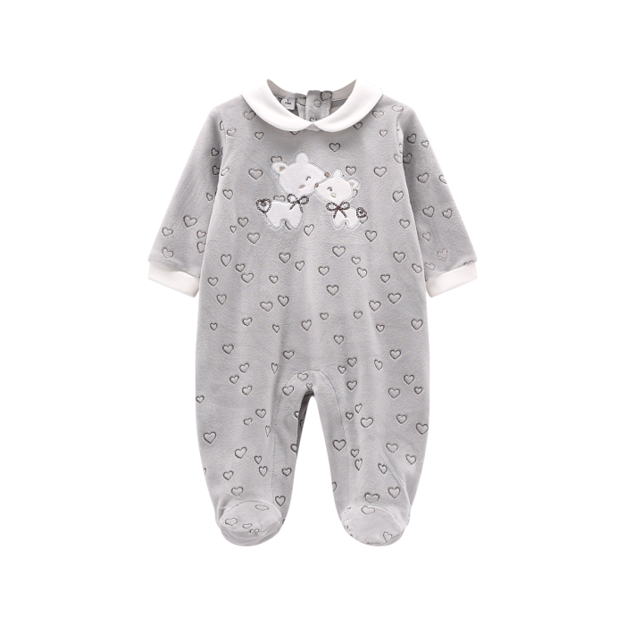 Tutina con piede realizzata in ciniglia soft per neonata, con tenera stampa allover e tenera decorazione frontale. Colletto bebè, pratica apertura a bottoncini sul retro.