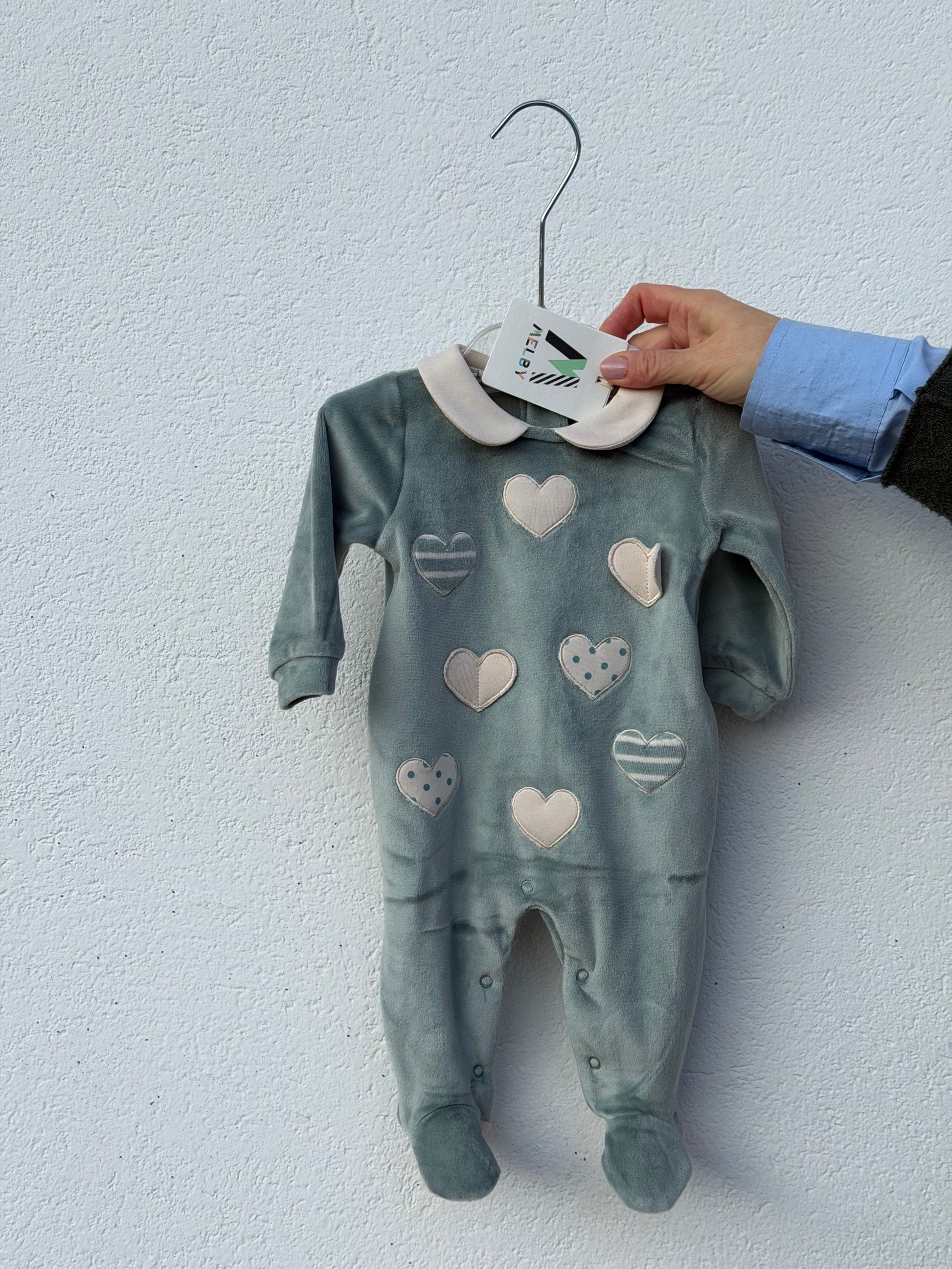 Tutina Melby in ciniglia in colore verde vetro con cuoricini e bottoncini sul retro. Super morbida!