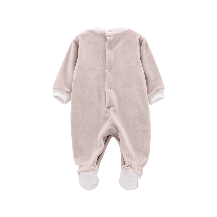 Tutina con piede per neonato, realizzata in ciniglia soft, con tenera applicazione frontale e apertura con bottoncini sul retro.